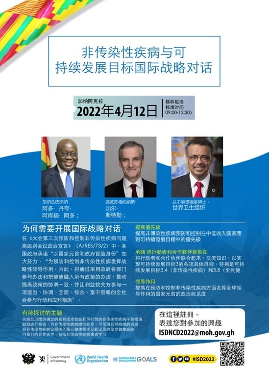 在《联合国2030年可持续发展议程》中,非传染性疾病被视为一项重大的全球挑战。该《议程》设定了到2030年将非传染性疾病导致的过早死亡减少三分之一的具体目标。世卫组织在协调和促进全球防治非传染性疾病和实现可持续发展具体目标3.4方面发挥着关键领导作用。
